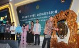 Gubernur Bank Indonesia Perry Warjiyo memukul gong didampingi Kepala Badan Litbang serta pendidikan dan Pelatihan Kementerian Agama RI Abdurrahman Mas’ud (kedua kanan) bersama pimpinan-pimpinan pondok pesantren pada acara pembukaan Indonesia Shari’a Economic Festival ke 5 (ISEF) dengan tema “The First Integrated Platform of Islamic Economy for Global Competitiveness” di Surabaya, Selasa (11/12). (FOTO : darmawan / republika)