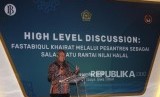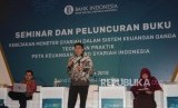 Kepala Departemen BI Solikin M Juhro (tengah) menyampaikan paparannya saat pada acara Seminar dan Peluncuran Buku berjudul, Kebijakan Moneter Syariah Dalam Sistem Keuangan Ganda: Teori dan Praktik Peta Keuangan Mikro Syariah Indonesia, pada rangkaian acara Indonesia Shari’a Economic Festival ke 5 (ISEF), di Surabaya, Rabu (12/12). (FOTO : darmawan / republika)