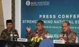 Gubernur Bank Indonesia Perry Warjiyo (tengah) bersama Kepala Departemen Ekonomi & Keuangan Syariah BI M. Anwar Bashori (kiri) dan Deputi Gubernur BI Dody Budi Waluyo (kanan) menyampaikan penjelasannya pada acara konperensi pers Indonesia Shari’a Economic Festival ke 5 (ISEF) dengan tema “The First Integrated Platform of Islamic Economy for Global Competitiveness” di Surabaya, Selasa (11/12). (FOTO : darmawan / republika)