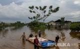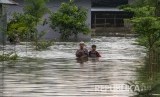 Warga berjalan menembus banjir akibat luapan Sungai Kampar yang merendam Desa Kubang Jaya, Kampar, Riau, Rabu (12/12/2018). (FOTO : Antara/Rony Muharrman)