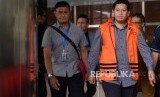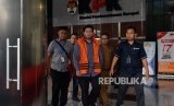 Bupati Cianjur Irvan Rivano Muchtar mengenakan rompi tahanan berjalan keluar ruangan seusai menjalani pemeriksaan di gedung KPK, Jakarta, Kamis (13/12). (FOTO : Republika/Prayogi)