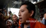 Bupati Cianjur Irvan Rivano Muchtar mengenakan rompi tahanan seusai menjalani pemeriksaan di gedung KPK, Jakarta, Kamis (13/12). (FOTO : Republika/Prayogi)