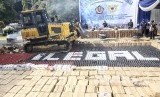 Petugas Direktorat Jenderal Bea Cukai Kantor Wilayah Sumatera Bagian Timur dibantu alat berat melakukan pemusnahan Barang Milik Negara (BMN) saat pemusnahan eks Kepabean dan Cukai Tahun 2018 dihalaman kantor Direktorat Jenderal Bea Cukai Kantor Wilayah Sumatera Bagian Timur, Palembang, Sumatera Selatan, Kamis (13/12) (FOTO : Nova Wahyudi/Antara)