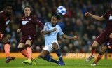Raheem Sterling (tengah) memperhatikan arah bola pada laga Grup F Liga Champions UEFA antara Manchester City melawan Hoffenheim di Etihad Stadium, Manchester, Inggris, Rabu (13/12) malam. (FOTO : Dave Thompson/AP)