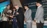Deputi Gubernur Bank Indonesia (BI) Dody Budi Waluyo (kiri) memberikan throphy kepada pembicara dari Professor of University of Bochum Germany Volker Nienhaus pada acara diskusi The 4th International Islamic Monetary Economic and Finance Conference (IIMEFC) 2018 pada rangkaian acara Indonesia Shari’a Economic Festival ke 5 (ISEF), di Surabaya, Kamis (13/12). (FOTO : darmawan / republika)