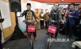 Gubernur Jawa Barat, Ridwan Kamil (kiri) dan Co-Founder and President Bukalapak Fajrin Rasyid mencoba BukaBike, layanan peminjaman sepeda dari aplikasi Bukalapak, pada acara peresmian kantor riset dan pengembangan Bukalapak di Bandung, Jumat (14/12). Bukalapak dan Pemerintah Provinsi Jawa Barat akan bekerjasama dalam perwujudan Jawa Barat berbasis digital (FOTO : Dok Bukalapak)