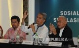 Kepala Badan Pengelola Keuangan Haji (BPKH) Anggito Abimanyu (tengah) bersama Deputi Direktur Departemen Ekonomi dan Keuangan Syariah Bank Indonesia Rifki Ismal (kiri) dan Anggota BPKH Bidang Operasional Iskandar memberikan penjelasan pada acara Diskusi Sosialisasi BPKH dan Simulasi Virtual Account dirangkaian acara Indonesia Shari’a Economic Festival ke 5 (ISEF), di Surabaya, Jumat (14/12). (FOTO : Darmawan/Republika)