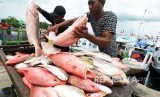 Nelayan mengangkat ikan hasil tangkapannya di Pelabuhan Paotere Makassar, Sulawesi Selatan, Jumat (14/12/2018). Sejak sepekan terakhir harga ikan di Makassar naik hingga 50 persen akibat cuaca buruk dan tingginya ombak di laut, sehingga ikan yang biasanya dijual Rp50 ribu per keranjang menjadi Rp 75 ribu per keranjang . (FOTO : Yusran Uccang/Antara)
