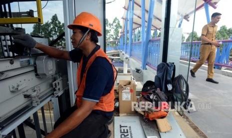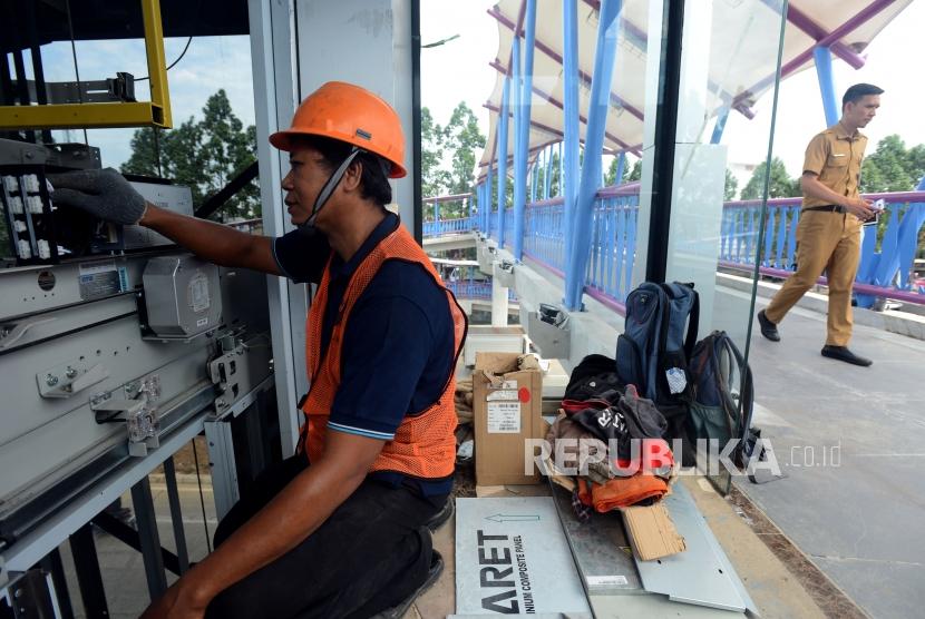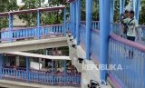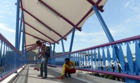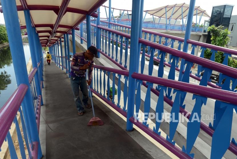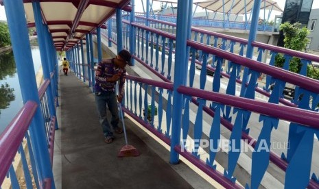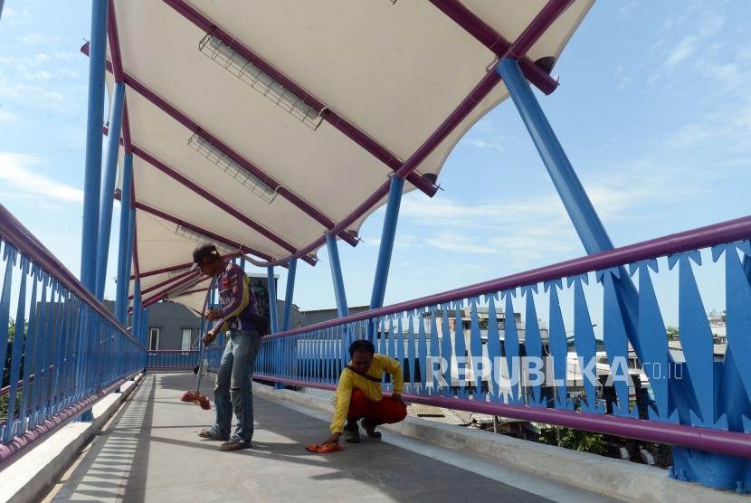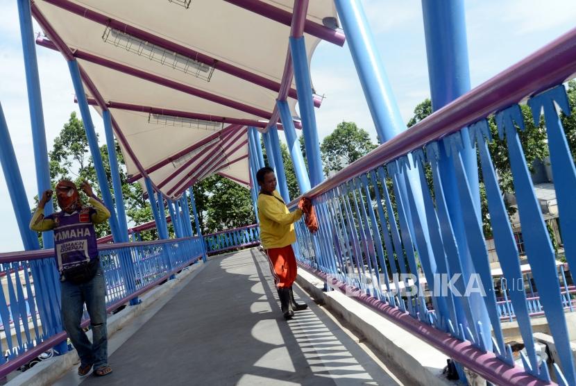 REPUBLIKA.CO.ID, JAKARTA -- Pekerja membersihkan Jembatan Penyeberangan Orang Jelambar Barat di Jalan Pangeran Tubagus Angke, Tambora, Jakarta Barat, Senin (17/12).