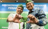 Managing Director Grab Indonesia Ridzki Kramadibrata (kiri) bersama Senior Executive Vice Presiden Komersial dan UMKM Bank BJB Beny Riswandi (kanan) menunjukan kartu ATM berupa identitas atau kartu anggota co-branding Bank BJB Grab Indonesia di Bandung, Jawa Barat, Senin (17/12). (FOTO : M Agung Rajasa/Antara)