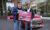 Pengemudi ojek online, Dedi Heryadi, pemenang hadiah utama Mini Cooper berfoto bersama Founder & CEO Bukalapak, Achmad Zaky di Jakarta, Senin (17/12). Dedi Heryadi berhasil memenangkan program Serbu Seru dengan membeli mobil mewah tersebut seharga Rp 12.000. (FOTO : Dok Bukalapak)