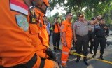 Petugas Dinas Pemadam Kebakaran Kota Surabaya memeriksa lokasi tanah ambles di Jalan Raya Gubeng, Surabaya, Jawa Timur, Rabu (19/12/2018). (FOTO : Antara/Didik Suhartono)