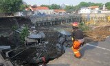 REPUBLIKA.CO.ID, SURABAYA -- Sejumlah petugas pemadam kebakaran memeriksa kondisi tanah ambles di Jalan Raya Gubeng, Surabaya, Jawa Timur, Rabu (19/12).