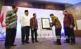 Direktur Pemberdayaan Zakat dan Wakaf Kementerian Agama RI Muhammad Fuad Nasar menandatangani mockup pada Peluncuran Buku Saku Prosedur Pengajuan Laegalitas Laz pada acara Indonesia Zakat Summit yang digelar Forum Zakat (FOZ), di Hotel Horison, Kota Bandung, Kamis (20/12). (FOTO : Republika/Edi Yusuf)
