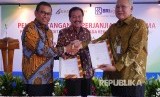 Direktur Utama BRI Agro Agus Noorsanto (kiri) dan Presdir PT Eagle High Plantation Tbk Nicolaas Bernadus Tirtadinata bertukar nota kerjasama di Jakarta disaksikan oleh Dirut Perum Jamkrindo Randi Anto di Jakarta, Kamis (20/12). Kedua pihak sepakat bekerjasama menyalurkan kredit komersial kepada rekanan Eagle High. (FOTO : Yogi Ardhi/Republika)