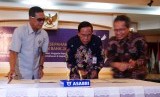 Dirut PT Asabri Sonny Widjaja (kiri), Dirut PT Bank BPD Jatim R Soeroso, dam Direktur Bank Jatim Suudi menandatangani MoU kerjasama kedua pihak di Jakarta, Kamis (20/12). Kerjasama mengatur pembayaran pensiun TNI, Polri dan ASN di wilayah Jawa Timur. (FOTO : Yogi Ardhi/Republika)