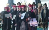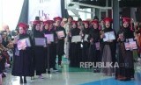 Sejumlah lulusan Islamic Fashion Institute (IFI) memegang sertifikat kelulusan usai mempresentasikan karyanya pada acara Haflatu At Takhorruj atau perayaan setelah menempuh ujian, di Click Square, Jalan Naripan, Kota Bandung, Rabu (19/12). (FOTO : Republika/Edi Yusuf)