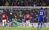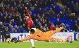 Gelandang Cardiff City Victor Camarasa mencetak gol ke gawang Manchester United pada laga Liga Primer Inggris antara Cardiff City dan Manchester United di Cardiff City Stadium, Cardiff, Wales, Inggris, Ahad (23/12). (FOTO : Jon Super/AP)
