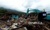 Sejumlah alat berat melakukan evakuasi bangunan yang terdampak tsunami di Desa Way Muli, Kalianda, Lampung Selatan, Senin (24/12). (FOTO : Republika/Putra M. Akbar)