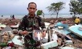 Seorang anggota TNI AL sedang menunjukkan foto-foto anggota keluarga Asep di reruntuhan rumahnya di Desa Way Muli, Rajabasa, Kabupaten Lampung Selatan. (FOTO : Republika/Mursalin Yasland)