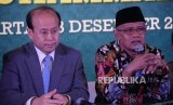 Ketua Umum PP Muhammadiyah Haedar Nasir bersama Duta Besar China untuk Indonesia Xiao Qian memberikan keterangan usai melakukan bersilahturahmi di Gedung Pusat Dakwah Muhammadiyah, Jakarta, Jumat (28/12). (FOTO : Republika/Prayogi)