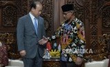 Ketua Umum PP Muhammadiyah Haedar Nasir menerima Duta Besar China untuk Indonesia Xiao Qian ketika bersilahturahmi di Gedung Pusat Dakwah Muhammadiyah, Jakarta, Jumat (28/12). (FOTO : Republika/Prayogi)