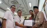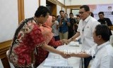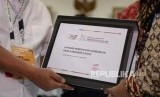 Penyerahan LPSDK ke KPU. Tim Kampanye Nasional (TKN) Joko Widodo-Ma’ruf Amin yang diwakili bendahara Sakti Wahyu Trenggono (kiri) dan Wakil Ketua TKN, Abdul Kadir Karding (kedua kiri) usai menyerahkan LPSDK di KPU, Jakarta, Rabu (2/1). (FOTO : Republika/ Wihdan)