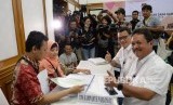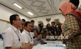 Penyerahan LPSDK ke KPU. Tim Kampanye Nasional (TKN) Joko Widodo-Ma’ruf Amin yang diwakili bendahara Sakti Wahyu Trenggono (kedua kiri) dan Wakil Ketua TKN, Abdul Kadir Karding (kiri) menyerahkan LPSDK kepada petugas di KPU, Jakarta, Rabu (2/1). (FOTO : Republika/ Wihdan)