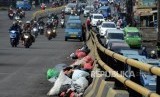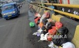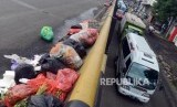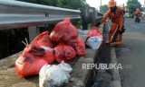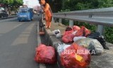 REPUBLIKA.CO.ID, DEPOK -- Petugas kebersihan membersihkan tumpukan plastik berisi sampah berada di pinggir Jalan Raya Bogor - Jakarta, Depok, Jawa Barat, Selasa (8/1).