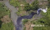 Foto udara limbah industri di Sungai Cihaur yang bermuara ke Sungai Citarum di Kecamatan Padalarang, Kabupaten Bandung Barat, Jawa Barat, Rabu (11/4). Meski adanya larangan membuang limbah oleh Kementerian Lingkungan Hidup dan Kehutanan, data dari Wahana Lingkungan Hidup Indonesia (Walhi) mencatat setidaknya 25 perusahaan di Kabupaten Bandung Barat masih membuang limbah industri ke anak Sungai Citarum ini. (FOTO : Raisan Al Farisi/Antara)