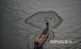 Nelayan mencari ikan di Sungai Citarum kawasan Rajamandala, Kabupaten Bandung Barat, Jawa Barat, Minggu (11/2). Kementerian Lingkungan Hidup dan Kehutanan (LHK) menargetkan pemulihan Sungai Citarum akan rampung selama tujuh tahun kedepan yang akan dibagi 22 sektor penataan. (FOTO : Raisan Al Farisi/Antara)