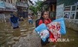 Seorang warga membawa perlengkapan tidur untuk mengungsi dari rumahnya yang terendam banjir di Kampung Bojong Asih, Dayeuhkolot, Kabupaten Bandung, Senin (12/11) (FOTO : Raisan Al Farisi/Antara)