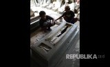 Pengrajin nisan dan kijing (bangunan) makam, Lukman,45, (kanan) menyelesaikan pembuatan kijing di bengkelnya di Jl Raya Cibinong, Kabupaten Bogor, Kamis (10/1). (FOTO : Yogi Ardhi/Republika)