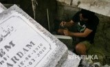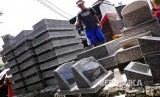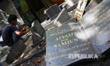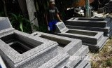 Pengrajin nisan dan kijing (bangunan) makam, Lukman (45) menata kijing buatannya di bengkelnya di Jl Raya Cibinong, Kabupaten Bogor, Kamis (10/1). (FOTO : Yogi Ardhi/Republika)