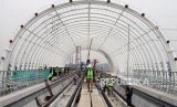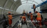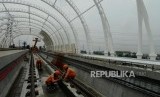 Pekerja menyelesaikan pembangunan stasiun LRT Taman Mini di Jakarta, Senin, (14/1). (FOTO : Republika/Putra M. Akbar)