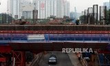 Pekerja menyelesaikan proyek pembangunan LRT di kawasan Cawang, Jakarta, Senin, (14/1). (FOTO : Republika/Putra M. Akbar)