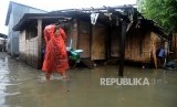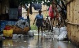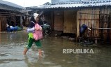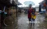 REPUBLIKA.CO.ID, JAKARTA -- Anak-anak melintasi genangan air saat terjadi banjir rob di kawasan Muara Angke, Jakarta Utara, Selasa (22/1).