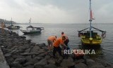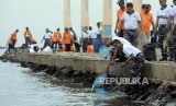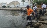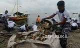 REPUBLIKA.CO.ID, JAKARTA -- Sejumlah pasukan TNI AL saat membersihkan sampah di Pantai Lagoon, Ancol, Jakarta, Selasa (22/1).