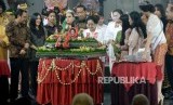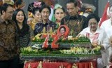 Presiden kelima RI Megawati Sukarnoputri memotong tumpeng disaksikan Presiden Joko Widodo saat perayaan ulang tahunnya di Jakarta, Rabu (23/1). (FOTO : Republika/Prayogi)