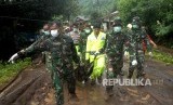 Petugas SAR gabungan mengangkat kantung jenazah korban tanah longsor yang terjadi di Kecamatan Manuju, Kabupaten Gowa, Sulawesi Selatan, Kamis (24/1/2019). (FOTO : Antara/Abriawan Abhe)