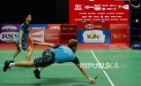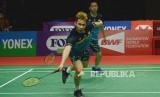 Ganda putra Indonesia Marcus Fernaldi Gideon-Kevin Sanjaya Sukomuljo mengembalikan kok kearah lawannya ganda putra Indonesia Mohammad Ahsan-Hendra Setiawan pada pertandingan final Daihatsu Indonesia Masters 2019 di Istora Senayan, Jakarta, Ahad (27/1). (FOTO : Republika/Edwin Dwi Putranto)