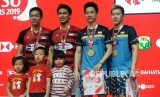 Ganda putra Indonesia Marcus Fernaldi Gideon-Kevin Sanjaya Sukomuljo bersama ganda putra Indonesia Mohammad Ahsan-Hendra Setiawan berpose seusai pertandingan final Daihatsu Indonesia Masters 2019 di Istora Senayan, Jakarta, Ahad (27/1). (FOTO : Republika/Edwin Dwi Putranto)