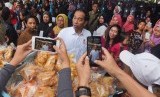 Presiden Joko Widodo (tengah) didampingi Menteri BUMN Rini Soemarno (kiri) membeli keripik dagangan warga usai panen raya udang di Muara Gembong, Bekasi, Jawa Barat, Rabu (30/1/2019), (FOTO : Antara/Akbar Nugroho Gumay)