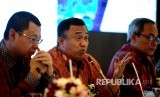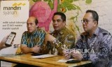SEVP Distribution and Services Bank Syariah Mandiri (BSM) Anton Sukarna (tengah) bersama Group Head Retail Deposit BSM DB Ivan Baruna (kiri) dan Corporate Secretary Ahmad Reza memberikan penjelasan kepada media mengenai kesiapan Mandiri Syariah sebagai mitra distributor Sukuk Tabungan Seri ST003, di Jakarta, Rabu (30/1). (FOTO : darmawan / republika)