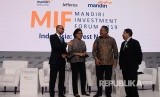 Advisory Board Chairman of Mandiri Institute M. Chatib Basri, Menteri Keuangan Sri Mulyani Indrawati, Gubernur Bank Indonesia Perry Warjiyo dan Wakil Direktur Utama Bank Mandiri Sulaiman A. Arianto berbincang usai pembukaan Mandiri Investment Forum (MIF) 2019 di Jakarta, Rabu (30/01). (FOTO : Prayogi/Republika)