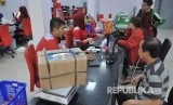 Petugas ekspedisi melayani pengiriman paket pelanggan di salah satu Kantor Cabang ekspedisi di Palembang, Rabu (30/1). Perusahaan ekspedisi di Palembang mengaku kenaikan harga kargo pesawat sangat berdampak pada kenaikan tarif pengiriman paket (FOTO : Feny Selly/Antara)