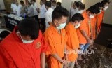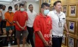 REPUBLIKA.CO.ID, JAKARTA -- Sejumlah tersangka diperlihatkan saat rilis kasus tindak pidana bidang kesehatan dan perlindungan konsumen terhadap pelaku usaha yang mengedarkan obat-obatan tanpa izin edar di Polda Metro Jaya, Jakarta, Kamis (7/2).