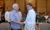 Menteri Komunikasi dan Informatika Rudiantara bersalaman dengan Mantan Ketua Dewan Pers Bagir Manan usai membuka konvensi nasional media massa dalam rangkaian HPN 2019 di Surabaya,Jawa Timur, Jumat (8/2). (FOTO : Republika/Prayogi)