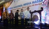 Menteri Komunikasi dan Informatika Rudiantara bersiap memukul gong didampingi Ketua Dewan Pers Yosep Adi Prasetyo (dua kanan), Gubernur Jatim Soekarwo (tengah), Ketua Umum Persatuan Wartawan Indonesia (PWI) Pusat Atal S.Depari (dua kiri) dan Penanggung Jawab Hari Pers Nasional (HPN) Margiono (kiri) saat membuka konvensi nasional media massa dalam rangkaian HPN 2019 di Surabaya,Jawa Timur, Jumat (8/2). (FOTO : Republika/Prayogi)