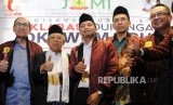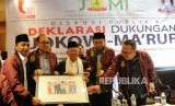Ketua Jaringan Alumni Mesir Indonesia (JAMI) Aas Subarkah, UKP Khusus Urusan Timur Tengah Alwi Shihab, calon Wakil Presiden nomor 01 Ma'ruf Amin, TGB M Zainul Majdi dan Renald kasali (dari kiri) saat menerima tanda simbolis deklarasi dukungan pasangan Capres dan Cawpares no 01 di Jakarta, Sabtu (9/2). (FOTO : Tahta Aidilla/Republika)